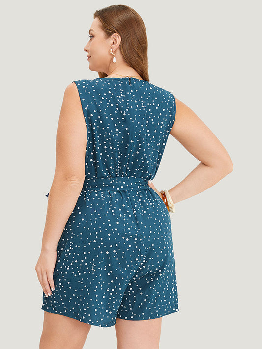 Polka Dot V Neck Pocket Sleeveless Belted Romper