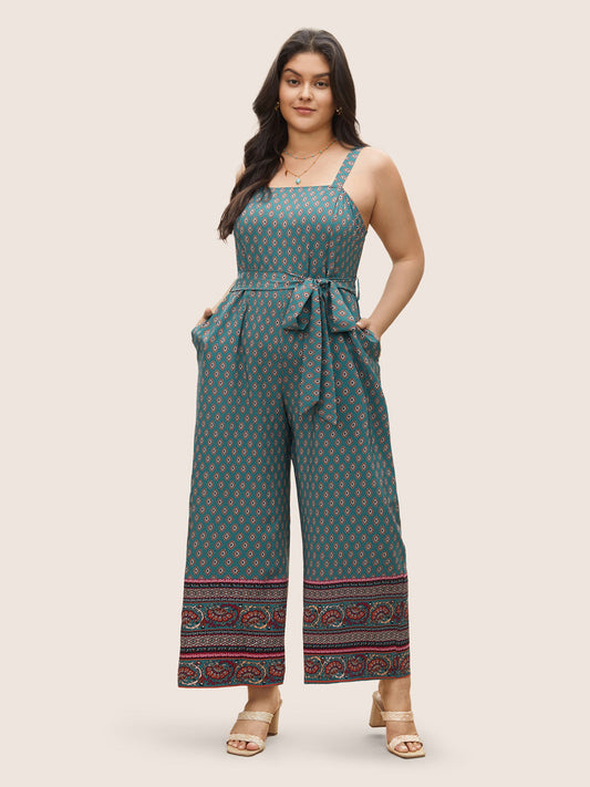 Boho Print Shirred Belted Adjustable Straps Jumpsuit