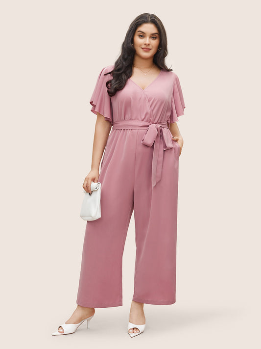 Anti-Wrinkle Plain Belted Flutter Sleeve Zipper Jumpsuit