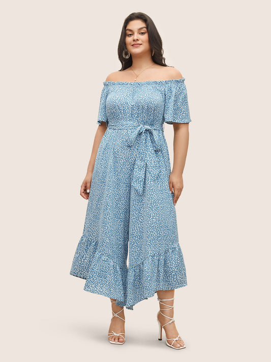 Polka Dot Off Shoulder Ruffles Belted Jumpsuit