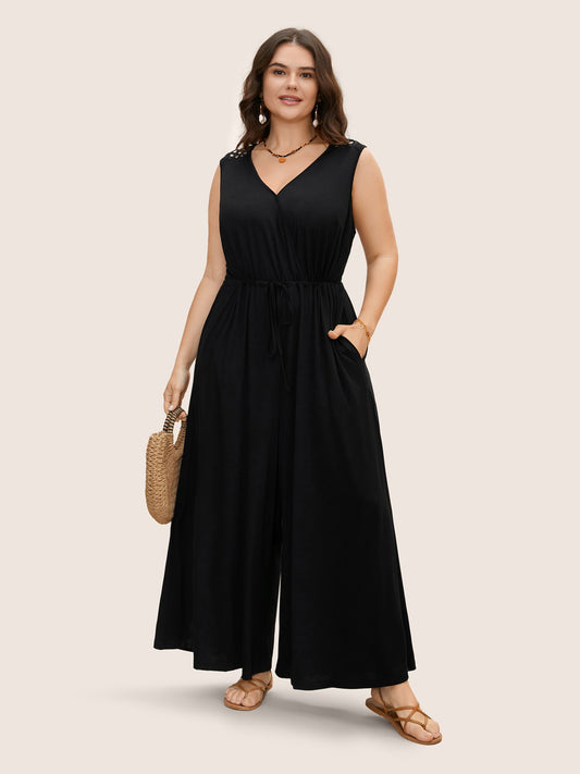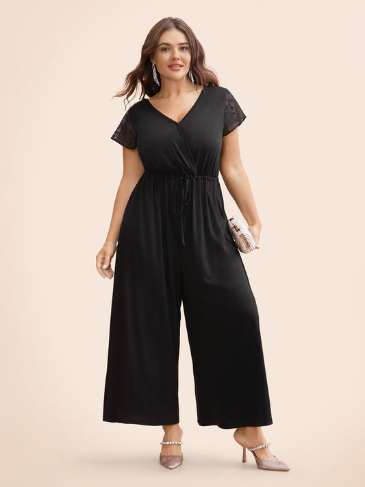 Overlap Collar Drawstring Mesh Cap Sleeve Jumpsuit