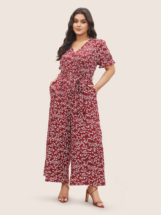 Ditsy Floral Wrap Belted Gathered Jumpsuit