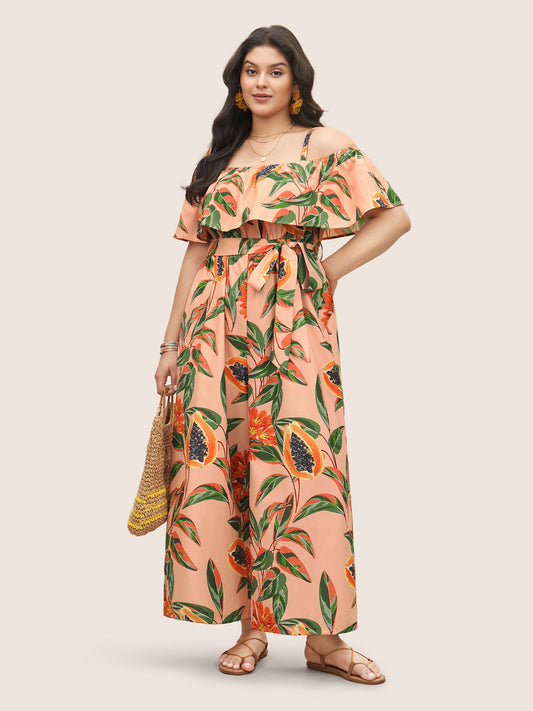 Citrus Fruit Print Belted Ruffle Trim Jumpsuit