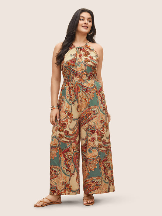 Paisley Print Halter Shirred Elastic Waist Jumpsuit