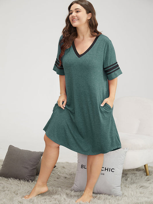 Striped Contrast Pocket Raglan Sleeve Round Neck Sleep Dress