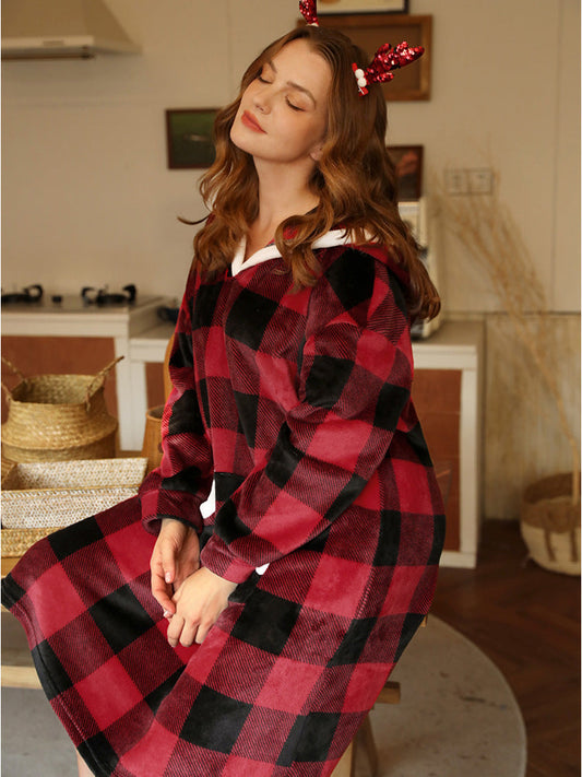Plaid Fuzzy Trim Pocket Hooded Dress