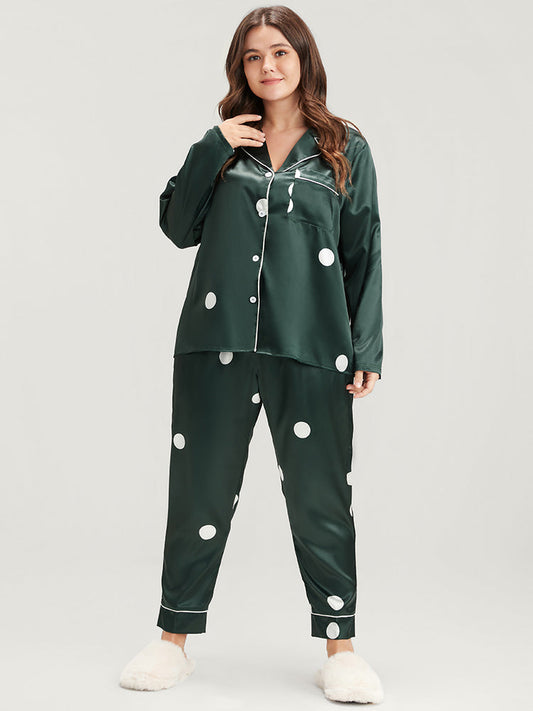 Polka Dot Contrast Trim Pocket Satin Pajama Set