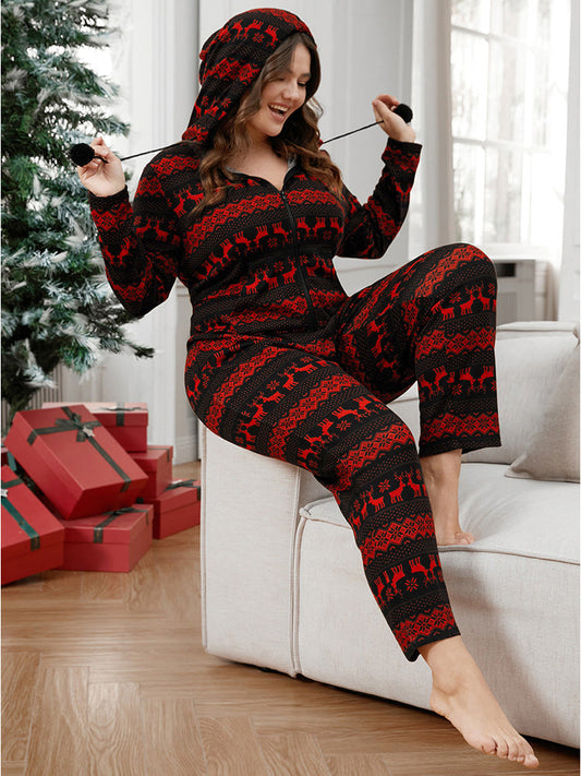 Elk & Snowflake Print Pocket Drawstring Zipper Hooded Jumpsuit