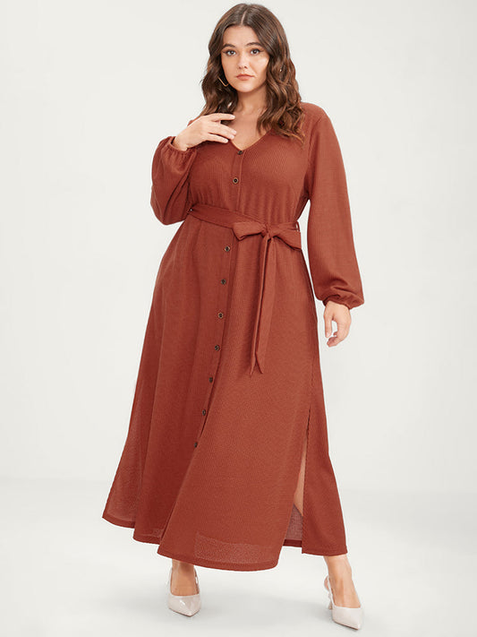 Solid Lantern Sleeve Pocket Button Detail Waffle Knit Belted Dress