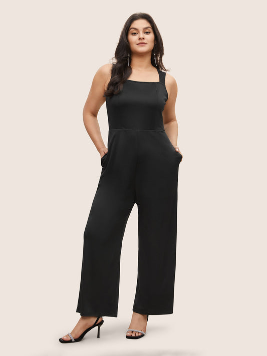 Solid Patchwork Pocket Square Neck Sleeveless Jumpsuit