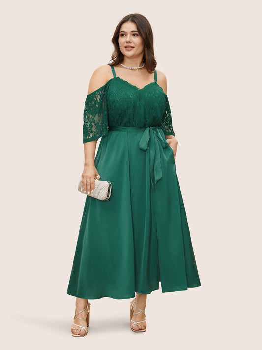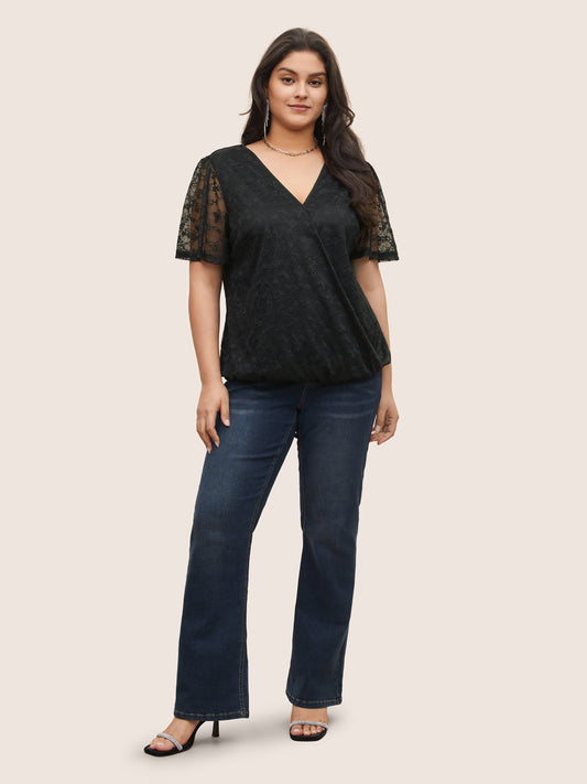 Overlap Collar Mesh Patchwork Lace Insert Blouse