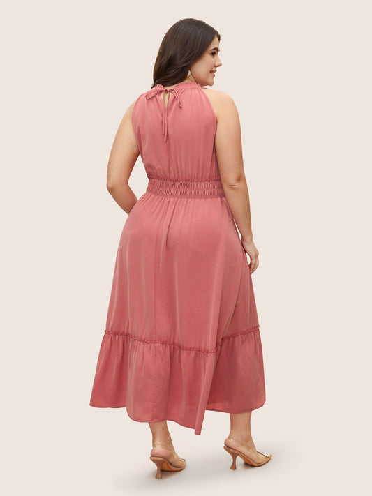 Halter Neck Shirred Frill Trim Gathered Dress