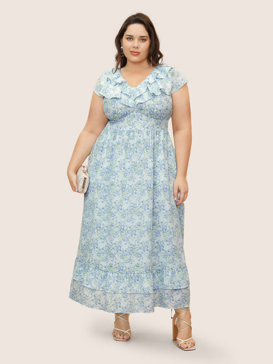 Floral Tiered Ruffles Shirred Pocket Dress