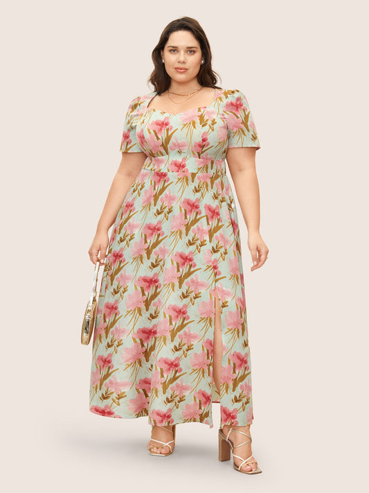 Heart Neckline Floral Print Shirred Dress