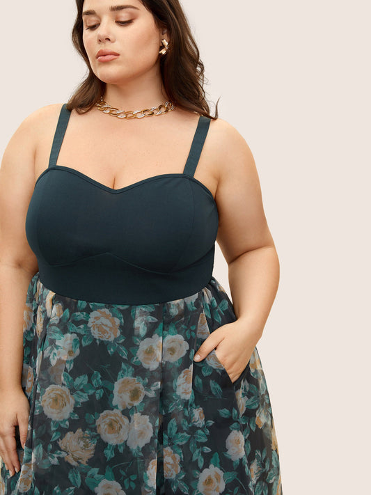 Floral Mesh Ruched Adjustable Straps Dress