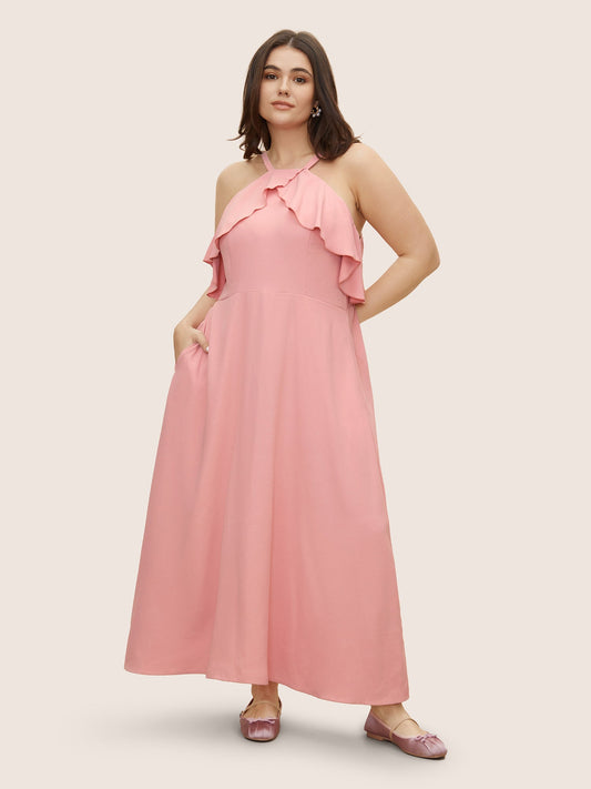 Plain Ruffle Trim Pocket Adjustable Straps Dress