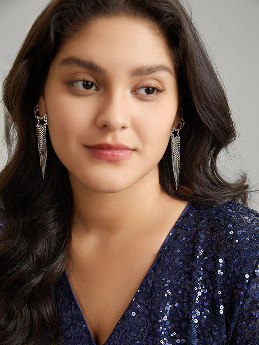 Rhinestone Star Long Silver Chain Tassels Earrings