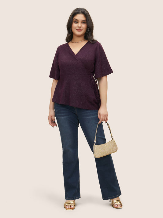 Plain Texture Wrap Ties Asymmetrical Hem Blouse