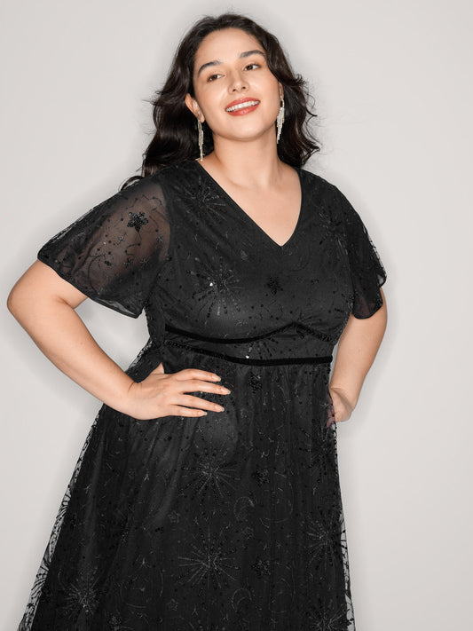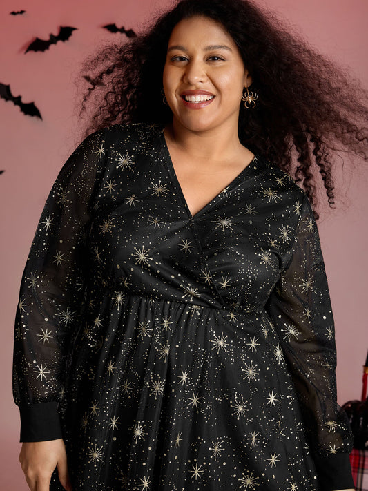 Star Moon Mesh Cinched-Waist Midi Dress