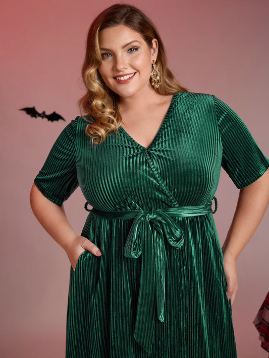 Glossy Textured Velvet Wrap Tied Midi Dress