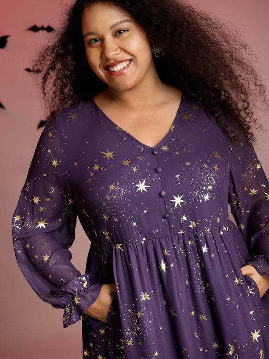 Chiffon Gold Celestial Print Tiered Midi Dress