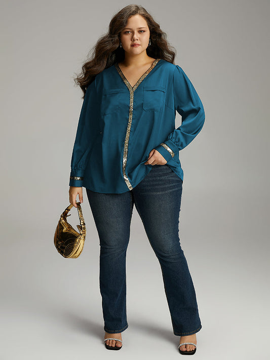 Chiffon Rhinestone Mesh Patchwork Elastic Waist Blouse