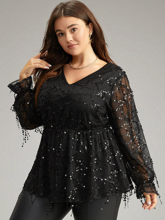 Halloween Sequin Mesh Elastic Waist Patchwork Blouse