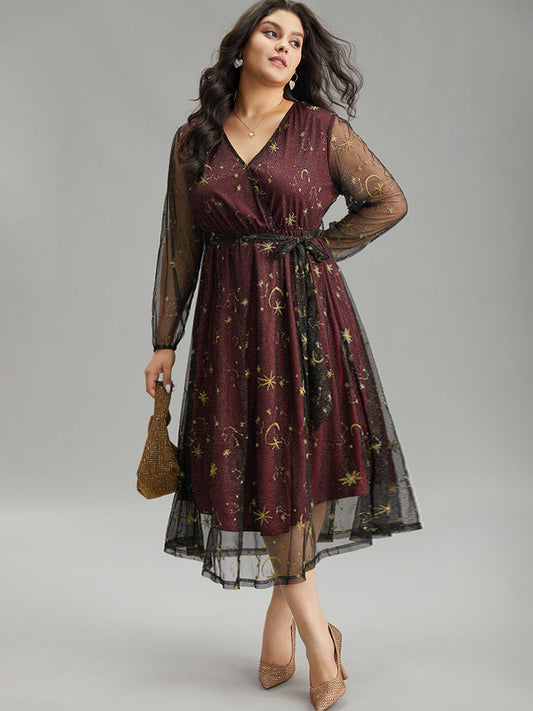 Chiffon Moroccan Print Glitter Belted Overlap Collar Dress