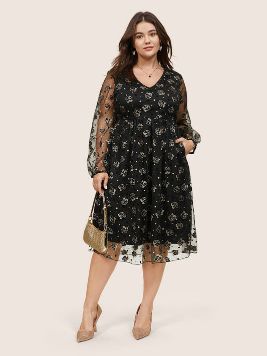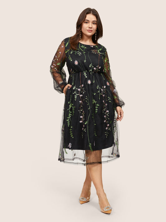 Floral Embroidered Mesh Pocket Lantern Sleeve Dress