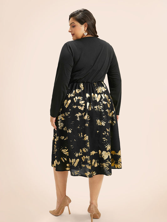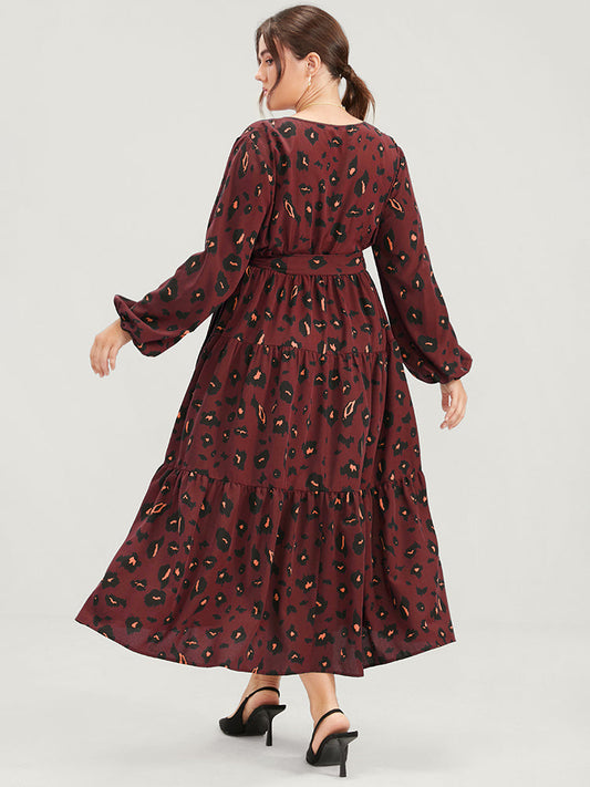 Pocket Button Surplice Neck Allover Print Belted Dress