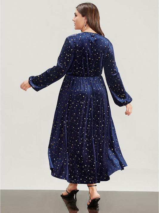 Halloween Star Print Wrap Lantern Sleeve Pocket Split Velvet Maxi Dress