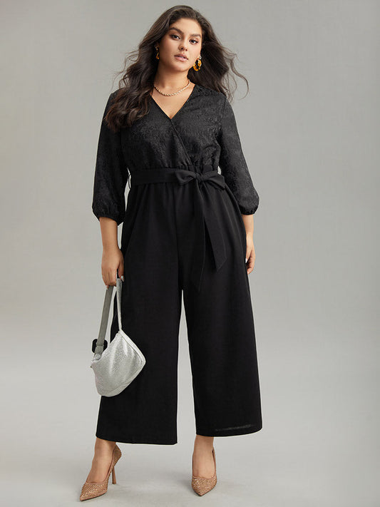 Plain Textured Belted Wrap Jumpsuit