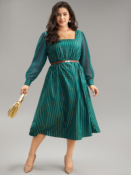 Glitter Striped Patchwork Mesh Square Neck Dress