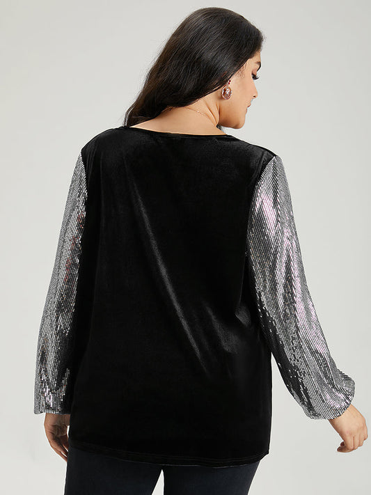 Sequin Patchwork V Neck Lantern Sleeve Sweatshirt