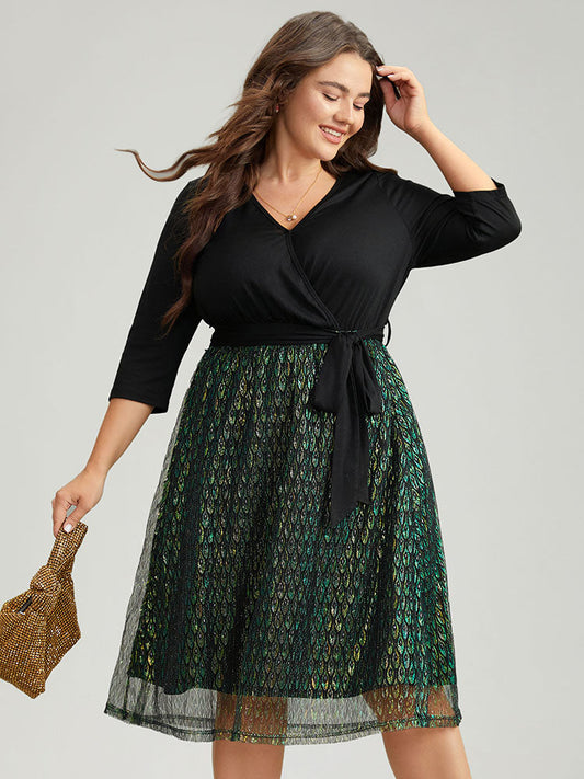 Geometric Patchwork Mesh Wrap Belted Dress