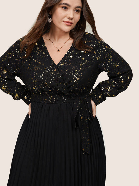 Star Glitter Belted Pleated Wrap Dress