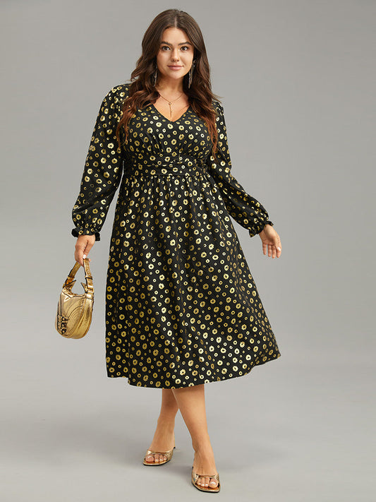 Floral Glitter V Neck Pocket Gathered Dress