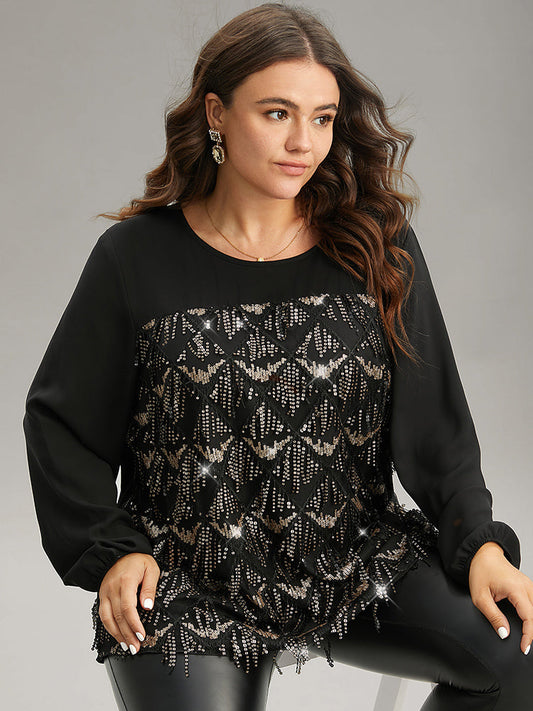 Sequin Tassel Trim Patchwork Lantern Sleeve Blouse