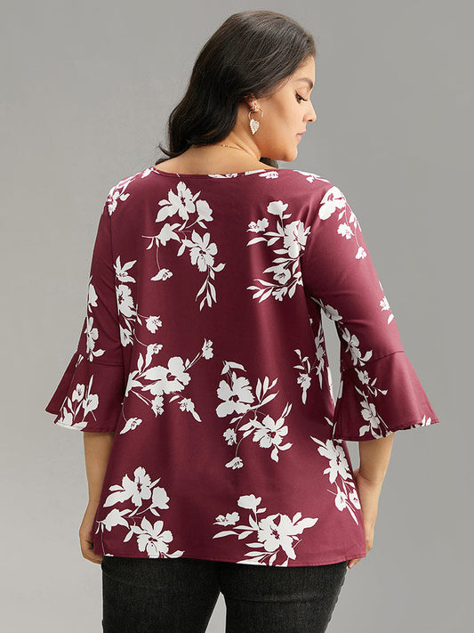 Silhouette Floral Print Ruffle Sleeve Twist Front Blouse
