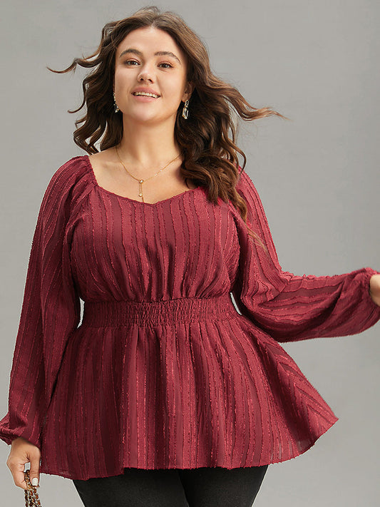Plain Textured Shirred Lantern Sleeve Gathered Blouse