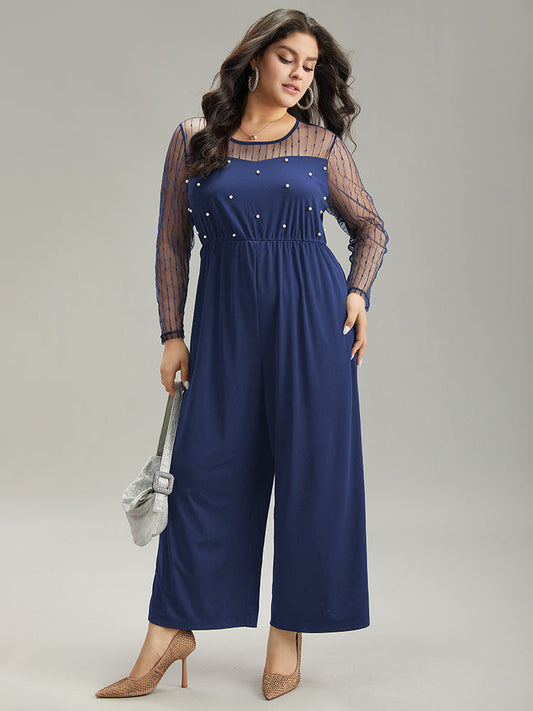 Pearl Beaded Mesh Patchwork Zipper Jumpsuit