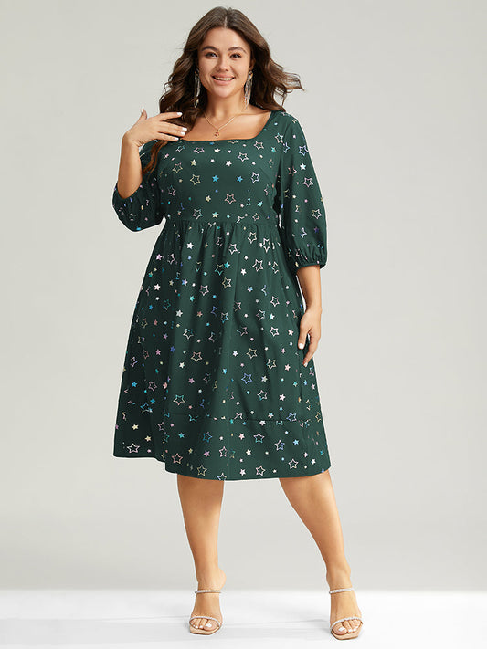 Heart Glitter Square Neck Lantern Sleeve Dress