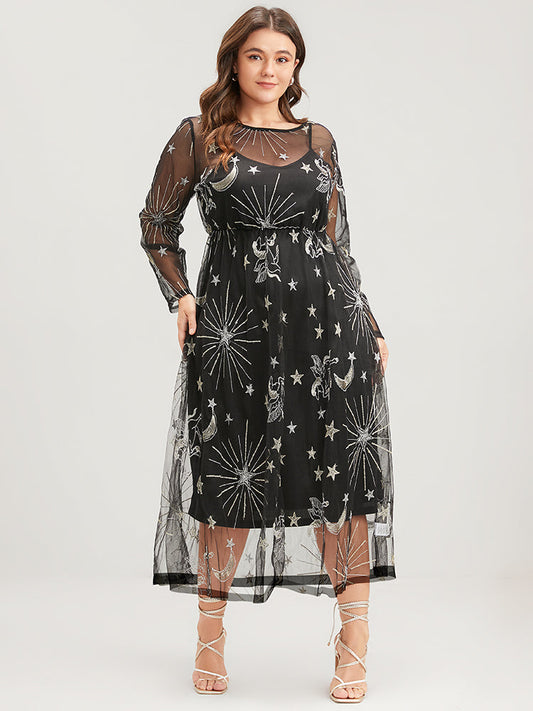 Halloween Moon And Star Elastic Waist Embroidered Mesh Midi Dress