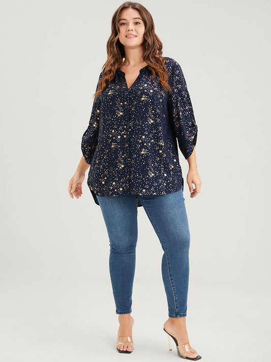Star Button Front Cuffed Sleeve Asymmetrical Hem Blouse