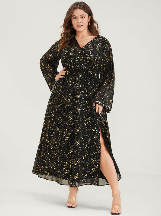 Star Split Button Bell Sleeve Flutter Hem Wrap Maxi Dress