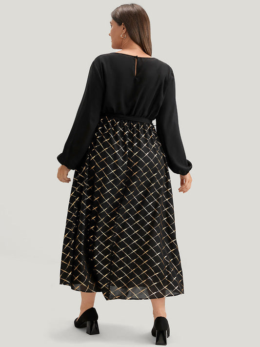 Geometric Print Pocket Lantern Sleeve Belted Dress