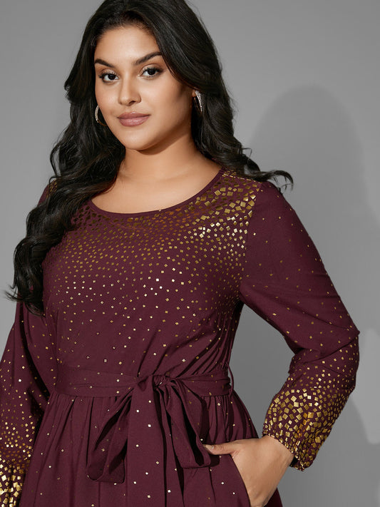 Glitter Round Neck Belted Lantern Sleeve Dress