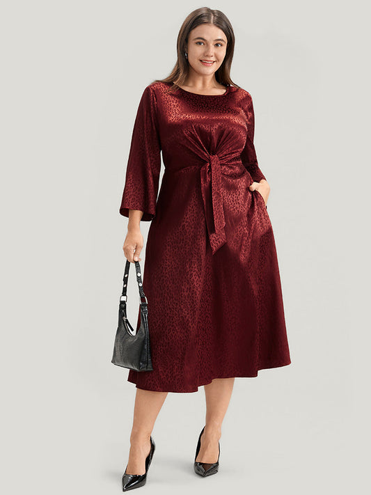Polka Dot Round Neck Pocket Lantern Sleeve Belted Flutter Dress