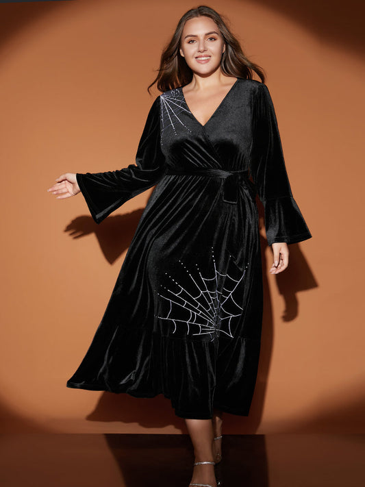 Halloween Spider Web Print Bell Sleeve Wrap Belted Dress