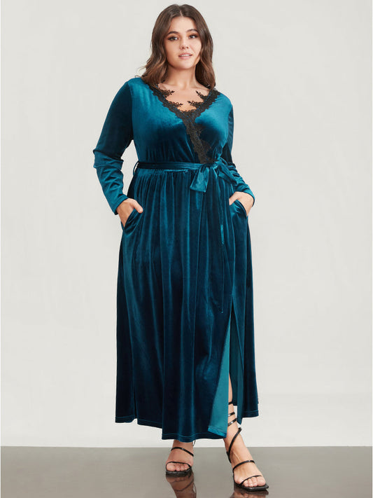 Halloween Solid Wrap Lace Trim Pocket Belted Split Maxi Dress